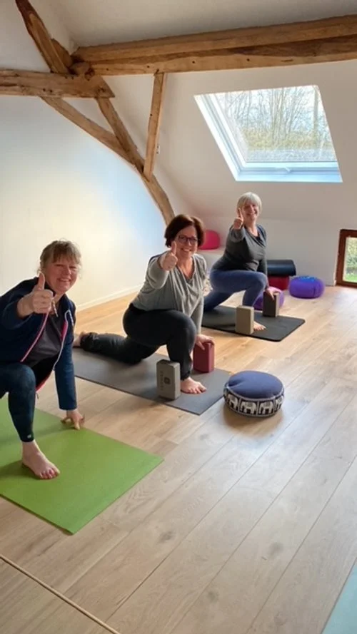 Asanas (Postures): La séance alterne postures dynamiques et statiques , toujours dans le respect du rythme de chacun